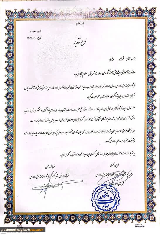 امتیاز دهید : تقدیر فرماندار محترم شهرستان از ریاست و معاونت مرکز بابت برگزاری نمایشگاه هفته پژوهش 6 شنبه 22 آذر 1404 ساعت 21:30